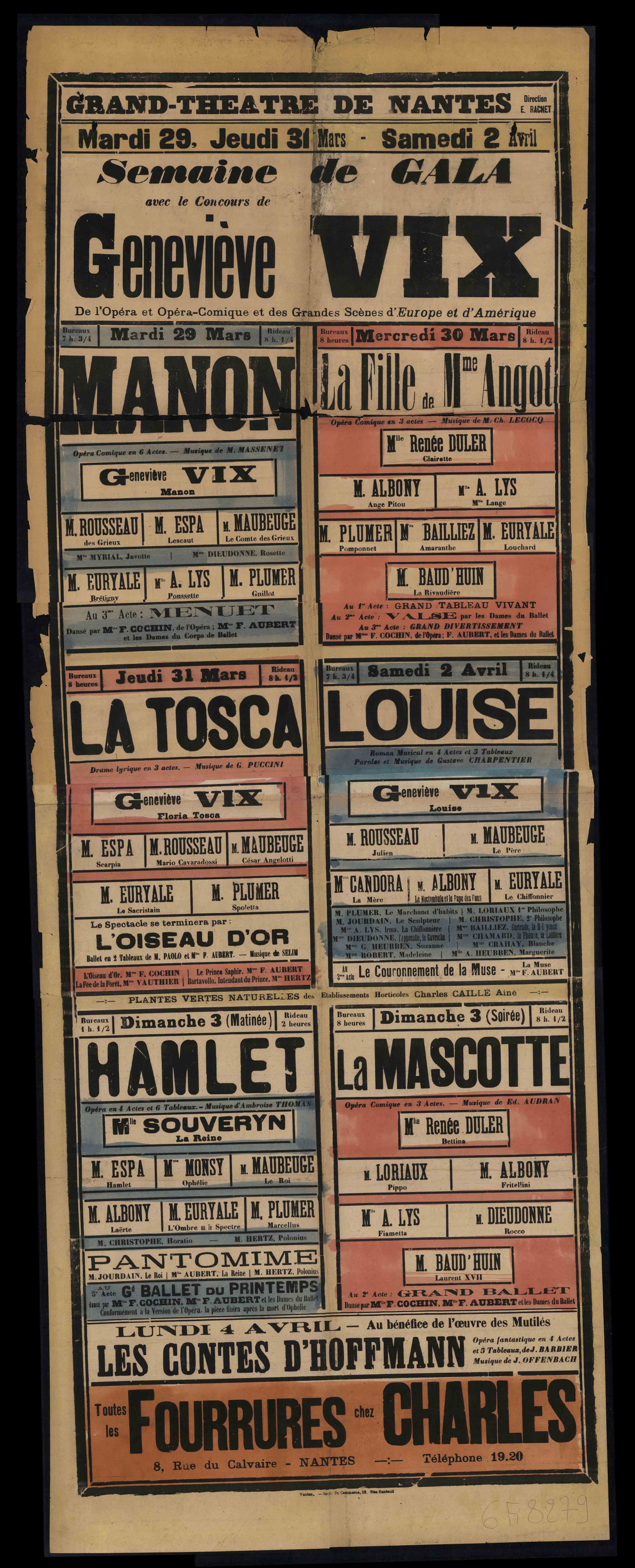 Les Archives de Nantes conservent ainsi une affiche annonçant une semaine de gala au Grand-Théâtre en 1921, « avec le concours de Geneviève Vix, de l’Opéra et Opéra-Comique et des Grandes Scènes d’Europe et d’Amérique ».