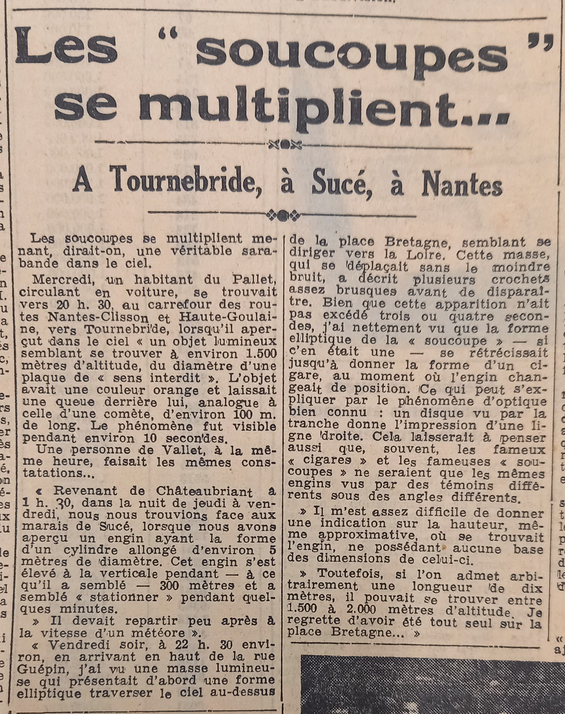 L'automne 1954 est une période où les observations d’ovnis (objets volants non identifiés) sont nombreuses. Nantes n’échappe pas aux passages de ces étranges phénomènes inexpliqués qui ont défrayé la chronique. De la Côte d’Ivoire à Trieste, en passant par Sucé-sur-Erdre, les soucoupes ont eu des trajectoires bien mystérieuses. Certains témoignages dignes d’un roman de René Fallet méritent l’attention des lecteurs de La Résistance de l’Ouest (23PRES16).