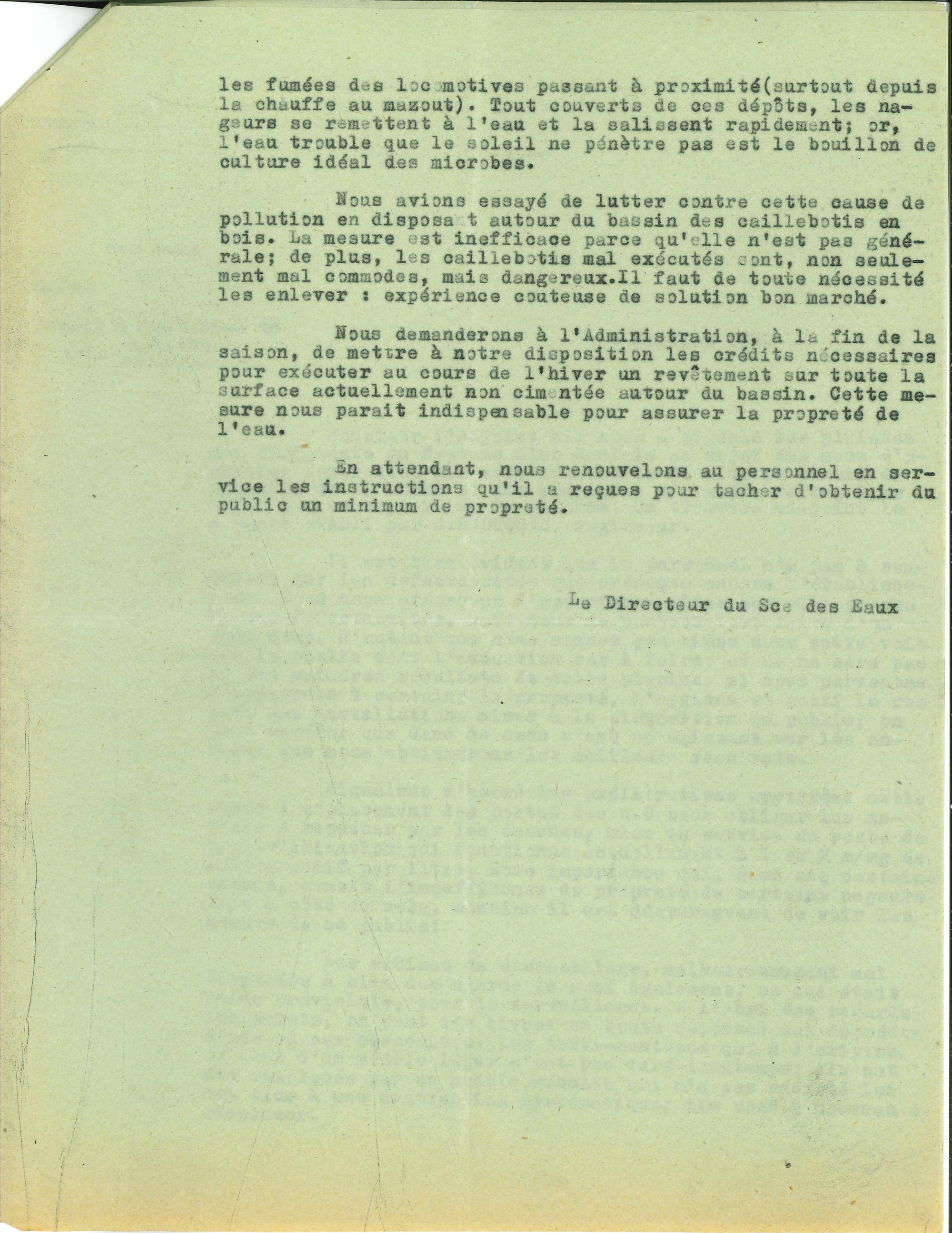 Le 5 juillet 1950, le directeur du Service des Eaux transmet à l’administration municipale les conclusions d’un rapport du régisseur de la piscine, M. Bourgues. Celui-ci dresse un état alarmant de la situation sanitaire de la piscine de la Roche.